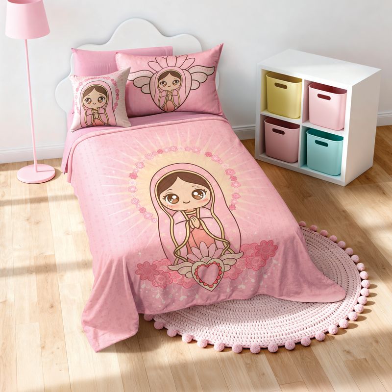 El Cobertor Ultrasuave Virgencita Cute es la prenda esencial para brindar un descanso acogedor y lleno de serenidad. Su diseño encantador, protagonizado por una ilustración tierna, llena de luz la habitación mientras su textura premium envuelve a los niños en una suavidad inigualable. Es el aliado perfecto para las bajas temperaturas de enero, proporcionando un abrigo reconfortante que invita a un sueño profundo y reparador en un entorno de paz.